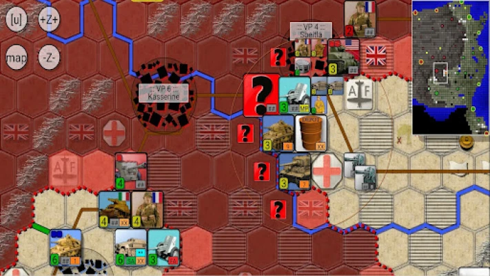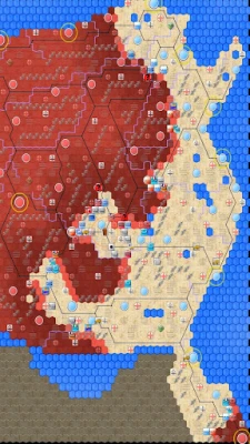 The Allies are rebuilding and regrouping after the failed run to Tunis; the British 8th Army is still far away; and the Allied stranglehold on the Axis supply routes from Europe to Tunisia is only just starting to severely reduce the flow of resources. This is the perfect chance for the Axis units concentrating in Tunis to try to flank and encircle a handful of the most advanced Allied divisions by attacking via the Kasserine Pass to take on the inexperienced Americans, seizing the Allied fuel depots located behind the city of Tebessa, and using that extra fuel to drive Panzer Divisions all the way to the city of Bone (northwest corner). If successfully carried out, this difficult maneuver might, once again, turn the tide of war in North Africa and maybe even prevent the notorious collapse of the Axis armed forces in Tunisia.
