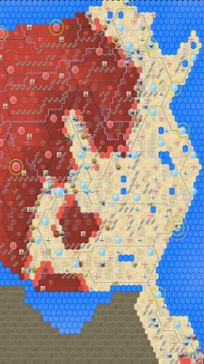 The Allies are rebuilding and regrouping after the failed run to Tunis; the British 8th Army is still far away; and the Allied stranglehold on the Axis supply routes from Europe to Tunisia is only just starting to severely reduce the flow of resources. This is the perfect chance for the Axis units concentrating in Tunis to try to flank and encircle a handful of the most advanced Allied divisions by attacking via the Kasserine Pass to take on the inexperienced Americans, seizing the Allied fuel depots located behind the city of Tebessa, and using that extra fuel to drive Panzer Divisions all the way to the city of Bone (northwest corner). If successfully carried out, this difficult maneuver might, once again, turn the tide of war in North Africa and maybe even prevent the notorious collapse of the Axis armed forces in Tunisia.