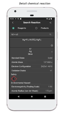 + In each reaction, your will get the detail of compound and element of reaction like formula, IUPACName, safeties, molecular weight, the reaction condition ...