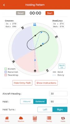 The Holding Pattern Calculator uses a detailed and informative graphic to help you determine your entry into a holding pattern, and then to maintain that pattern with wind corrections. Simply enter a few basic values to see them instantly reflected in the graphic, then follow the detailed entry and hold instructions.