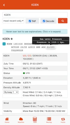 With E6BX Metar Decoder, almost everything in any given Metar or Taf is decodable, including elevation, wind direction and speed, wind components, pressure altitude, density altitude, air pressure, dew point, and all sorts of weather conditions.