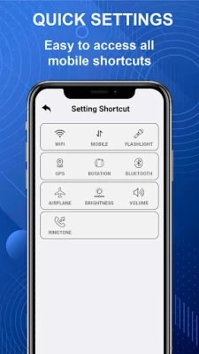 - Turn on/off WIFI, Mobile Data, Bluetooth, Flashlight, GPS, Rotation, Airplane Mode.