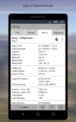 ➤ An editable waypoint-list for each route of your trip lets you keep a complete nautical ship's log in an intuitive manner. Sail-Log will allow you to enter text, choose from a set of logbook entries or shoot photos in-app as well as import them at a later time. Many different options are available for convenient storage of trips, routes and logs.